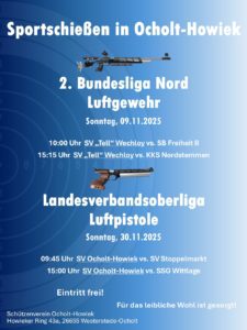 Anstehende Ligawettkämpfen der 2. Bundesliga Luftgewehr und Landesverbandsoberliga Luftpistole in Ocholt-Howiek:
