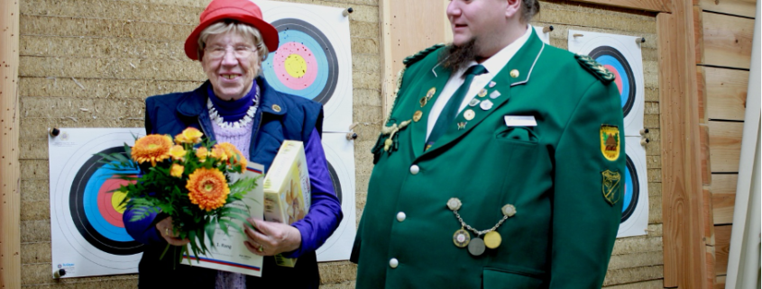 Für den Schützenkreis Oldenburg Stadt und den Oldenburger Schützenbund überraschte Gerald Lübbermann Christa bei der Siegerehrung der Kreismeisterschaft. Im Namen von Bezirk und Kreis überreichte er ihr einen Blumenstrauß und die Verbandsnadel des OSB.